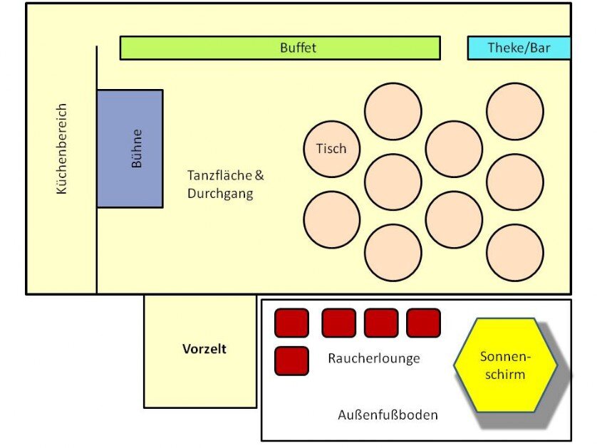 Bestuhlung mit Rundtischen ist im Festzelt die schönste Variante, benötigt im Gegensatz zu Stehtischen auch den meisten Platz. Im Tanz- und Durchgangsbereich genügend Platz lassen. DJ/Band mit Veranstaltungstechnik benötigen meistens eine Bühne. Service braucht nicht viel Platz aber ein Mindestmaß an Gangbreite und Arbeitsplatz sind für einen guten Service einfach unerlässlich.